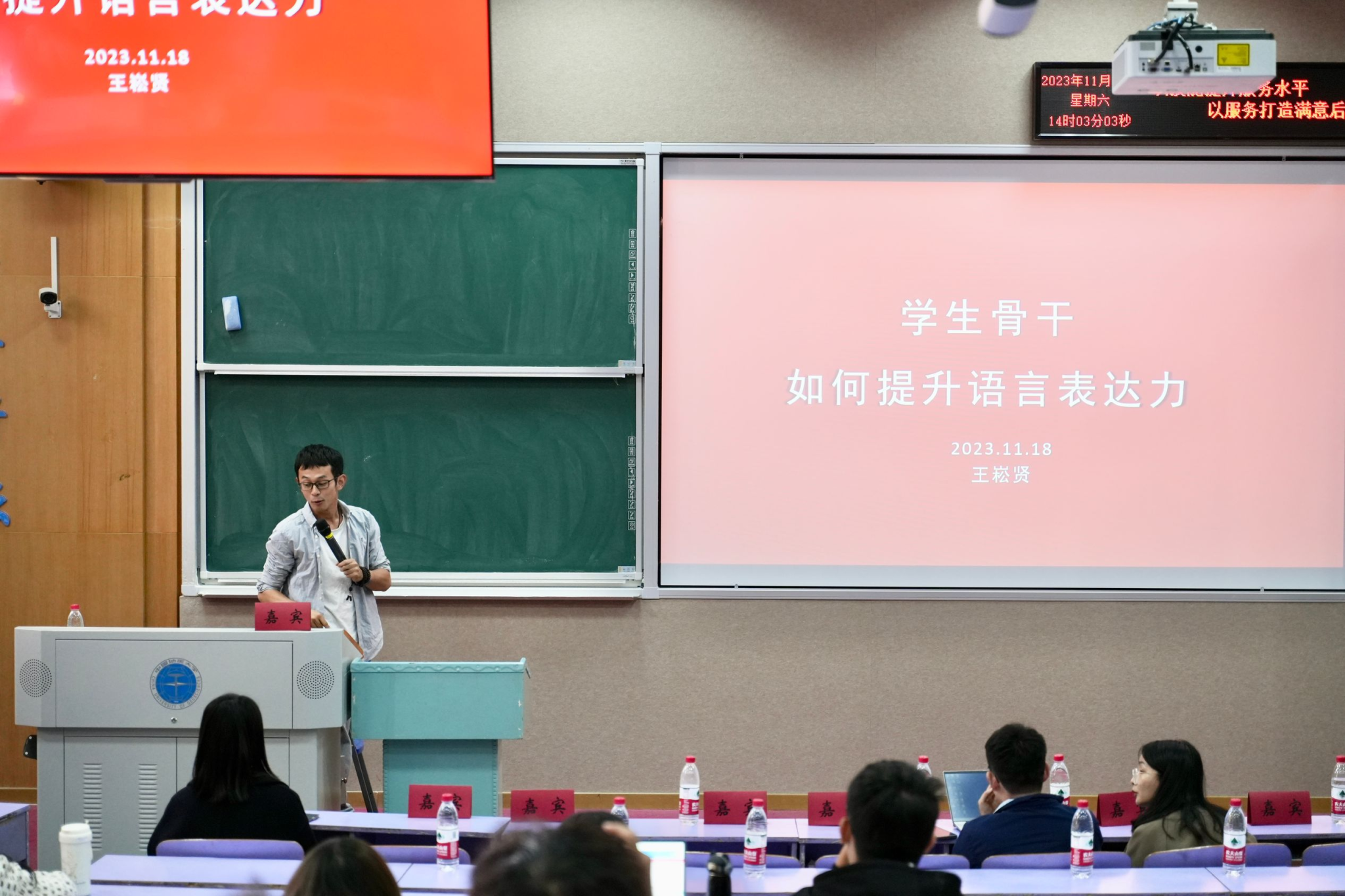 校研究生会主席王崧贤同学分享了自己多年的工作经验,总结出了与人交流沟通的“三大准则”。他提醒大家与人沟通前要做好准备工作,沟通时要保持平和的语气和谦逊的态度。为提高员工骨干的表达能力提供了方法指导。