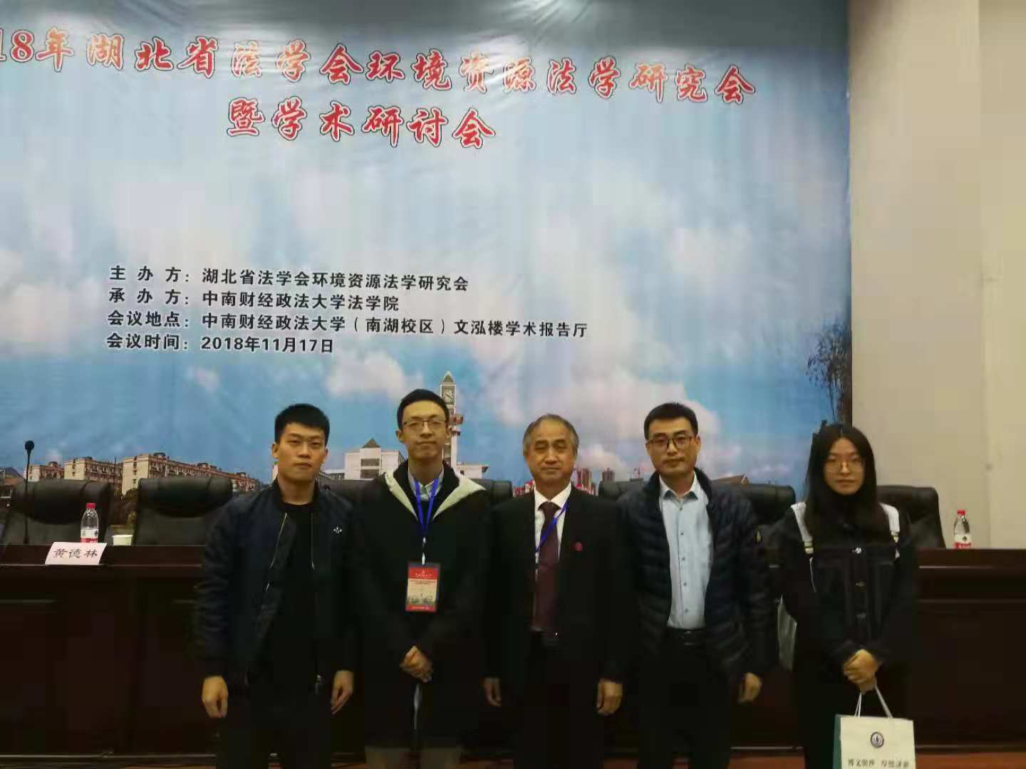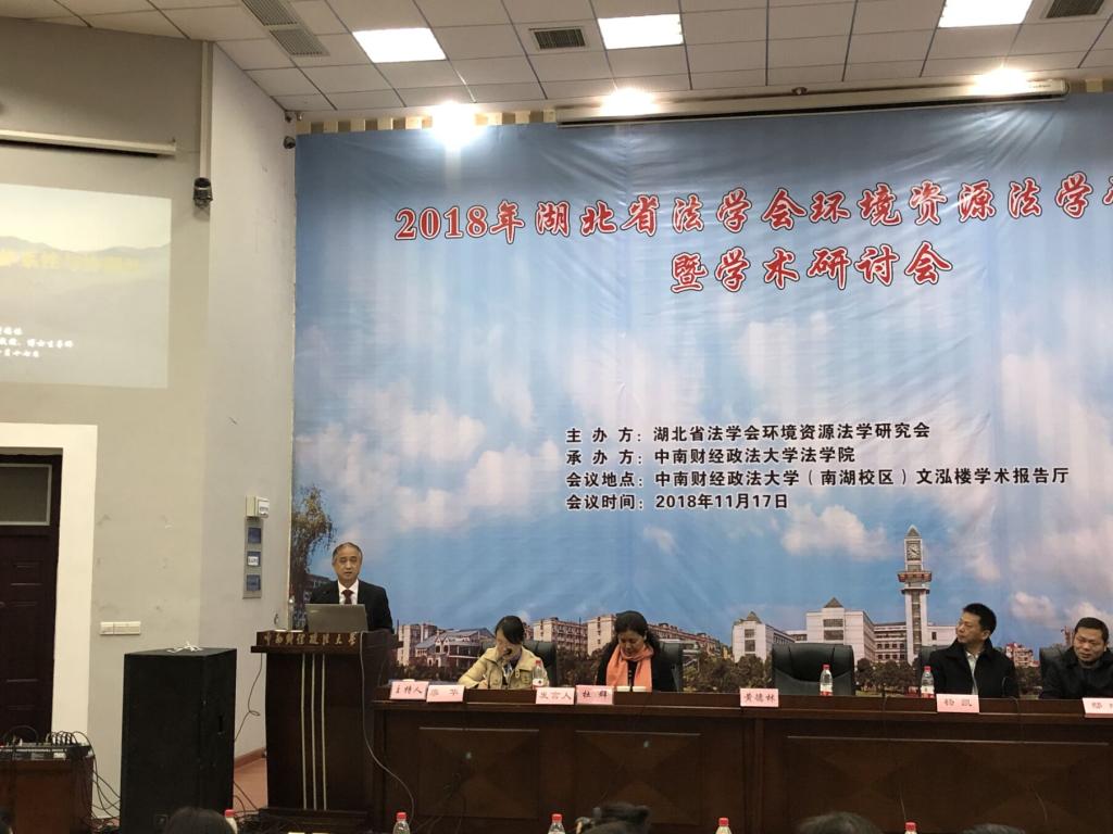 2018年11月17日,由湖北省法学会环境资源法学研究会主办,中南财经政法大学法公司承办的湖北省法学会环境资源法学研究会2018年年会暨学术研讨会在中南财经政法大学(南湖校区)文泓楼学术报告厅隆重召开。此次会议聚焦环境保护工作中的热点问题和重难点问题,围绕“人类命运共同体的环境法理、民法典草案、土地管理法、土壤污染防治法、环境税相关立法、国家公园和自然保护地法、排污许可立法”等多个主题展开了深入的学术研讨,形成了广泛学术共识,取得了丰硕的会议成果。公司博士生导师黄德林带领硕士生赵淼峰、张钊伟、本科生马佩瑶参加了本次会议。