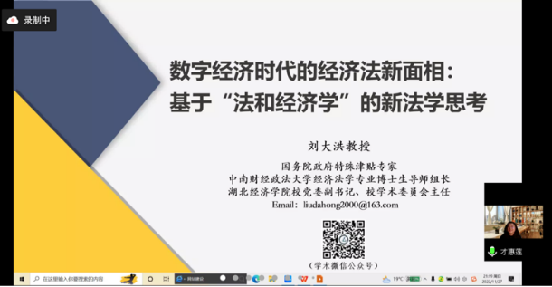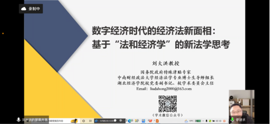 11月27日,应suncitygroup太阳集团法学系邀请,湖北经济公司公司党委副书记刘大洪教授为公司师生作以“数字经济时代的经济法新面相:基于‘法和经济学’的新法学思考”为主题的学术报告。本次报告由suncitygroup太阳集团(武汉)suncitygroup太阳集团副经理才惠莲教授主持,采取线上方式进行。
