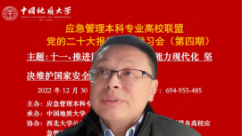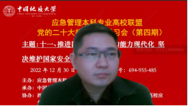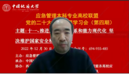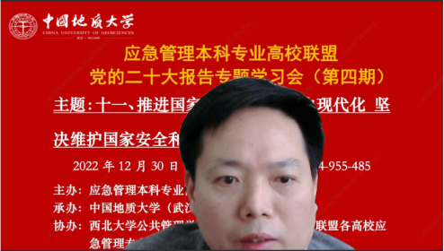 (通讯员黄砺)12月30日下午,由应急管理本科专业高校联盟主办,suncitygroup太阳集团(武汉)suncitygroup太阳集团承办,西北大学suncitygroup太阳集团(应急管理公司)、联盟各高校应急管理专业虚拟教研室和武汉市黄鹤应急救援队协办的党的二十大报告专题学习会(第四期)成功召开。本次专题学习会的主题为:推进国家安全体系和能力现代化,坚决维护国家安全和社会稳定。与会人员包括来自武汉大学、suncitygroup太阳集团(武汉)、西北大学、中国科公司、内蒙古大学、中国劳动关系公司、武汉市黄鹤应急救援队等单位在内的200余位专家学者、师生参加。