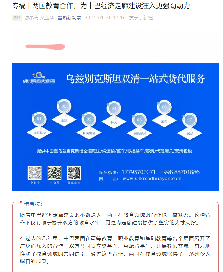 公司中巴经济走廊研究中心谢小青老师和员工文玉冰关于中巴教育合作的研究成果被丝路新观察刊载。