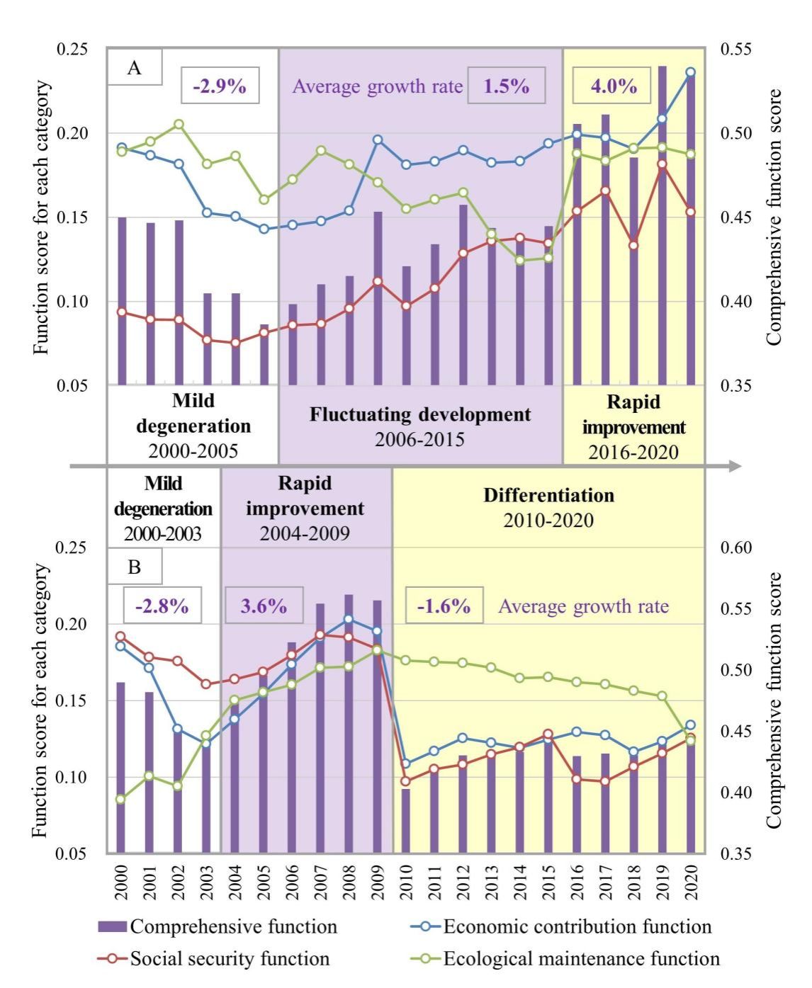 图2 施甸县(A)和仙居县(B)耕地利用功能转型阶段