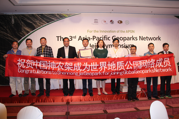 当日下午,在韩国济州岛举行的第三届亚太地质公园研讨会上,联合国教科文组织世界地质公园网络(GGN)执行局负责人尼古拉斯-邹若思教授宣布,湖北神农架、北京延庆等10家地质公园被GGN接纳为新成员。神农架林区党委书记周森锋代表神农架接受“中国神农架世界地质公园”标牌,全场报以热烈的掌声。至此,神农架正式成为中国第28家、湖北省第一家世界地质公园。