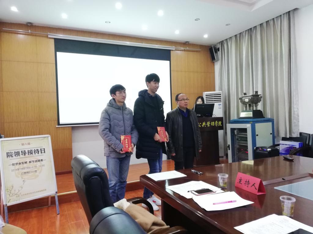 (通讯员 吴 波)2018年12月13日下午,第六期院领导接待日活动在公管楼B209会议室顺利举行。公司党委书记张吉军老师、党委副书记刘国华老师、副经理王忠老师、法学系副主任刘琦老师、公共行政系主任李世祥老师、区划系主任刘超老师、土地系刘成老师、教务科高秋丽老师、团委副书记李姝慧老师、辅导员吴波老师以及各年级同学代表50余人参加本次活动。
