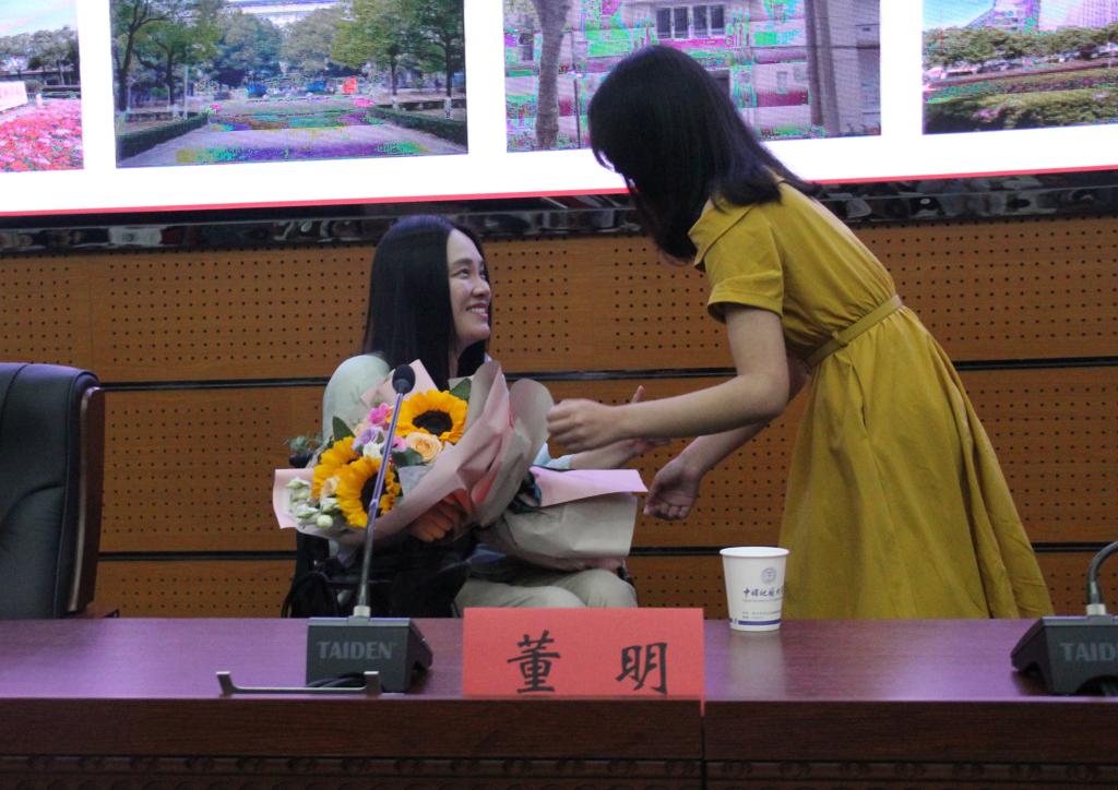 接下来,在场师生通过短片《轮椅上的天使》了解了主讲人董明老师的故事。全国道德模范、中国青年五四奖章获得者、抗震救灾模范……一系列荣誉的背后是常人难以想象的艰辛和付出。短片过后,董明老师从“不忘初心、持续坚持、学会感恩”三个关键词出发,与同学们分享自己的青春奋斗故事。“不忘初心”是董明老师奋斗历程中的动力源泉,“持续坚持”是董明老师成长路上的成功经验,“学会感恩”是董明老师面对挫折的生活态度。董明老师从国家需求大处着眼,以青年学子关注喜爱的小处落脚,报告内容积极励志、语言生动活泼,充满正能量的同时十分接地气,其不抱怨、不认命、不索取的奉献精神和奋斗精神令在场不少同学动容,现场多次响起热烈的掌声!