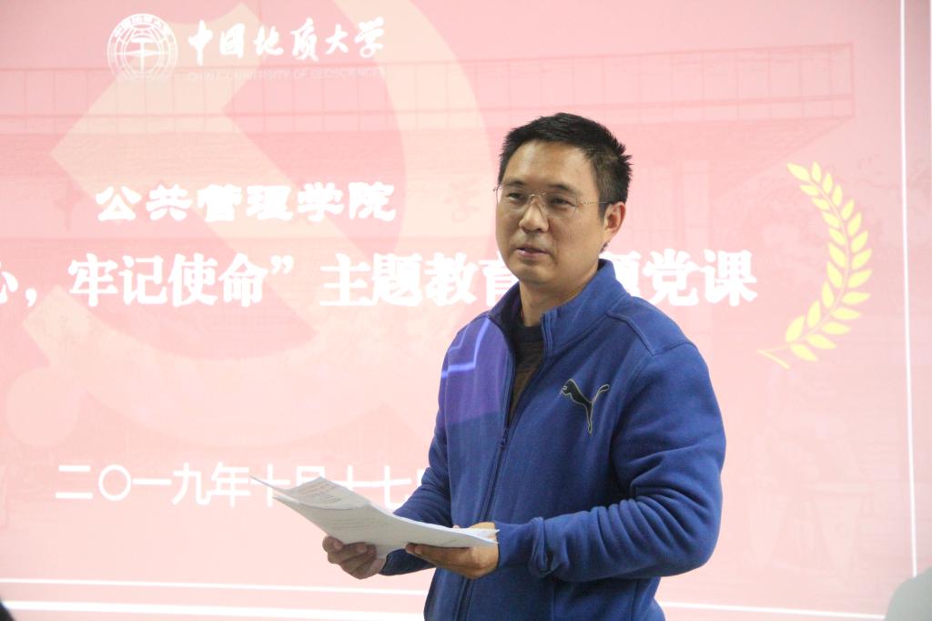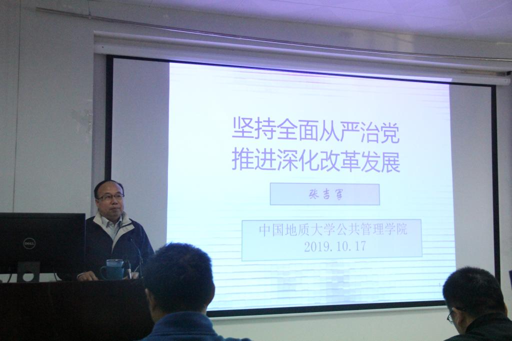 2019年10月17日下午,suncitygroup太阳集团“不忘初心、牢记使命”主题教育专题党课报告会于公管新楼101成功举行。公共管理公司党委书记张吉军为公司全体教工党员、员工党员代表以及发展对象作了主题为“坚持全面从严治党,推进深化改革发展”的专题党课,党课由公共管理公司党委副书记刘国华主持。