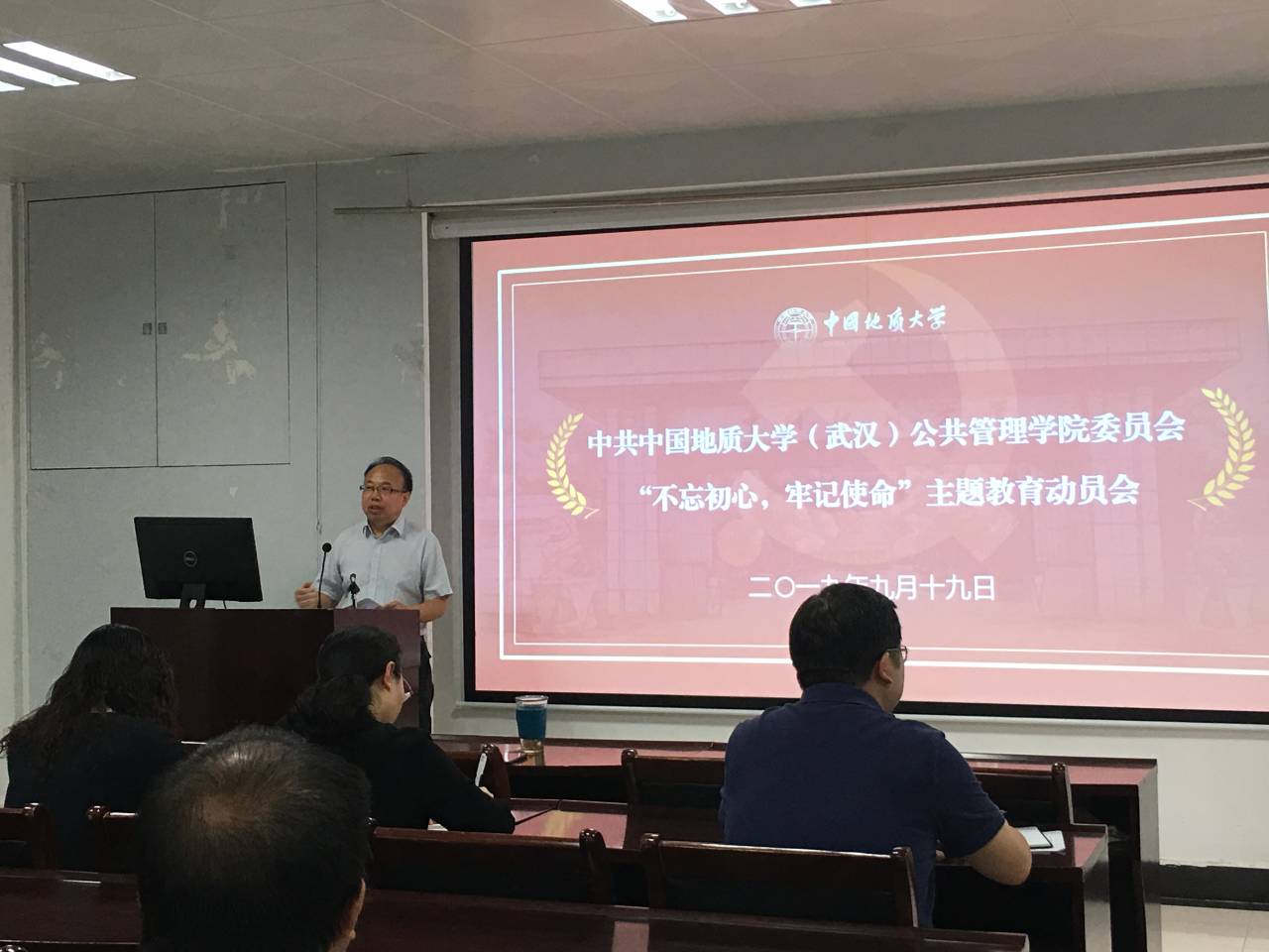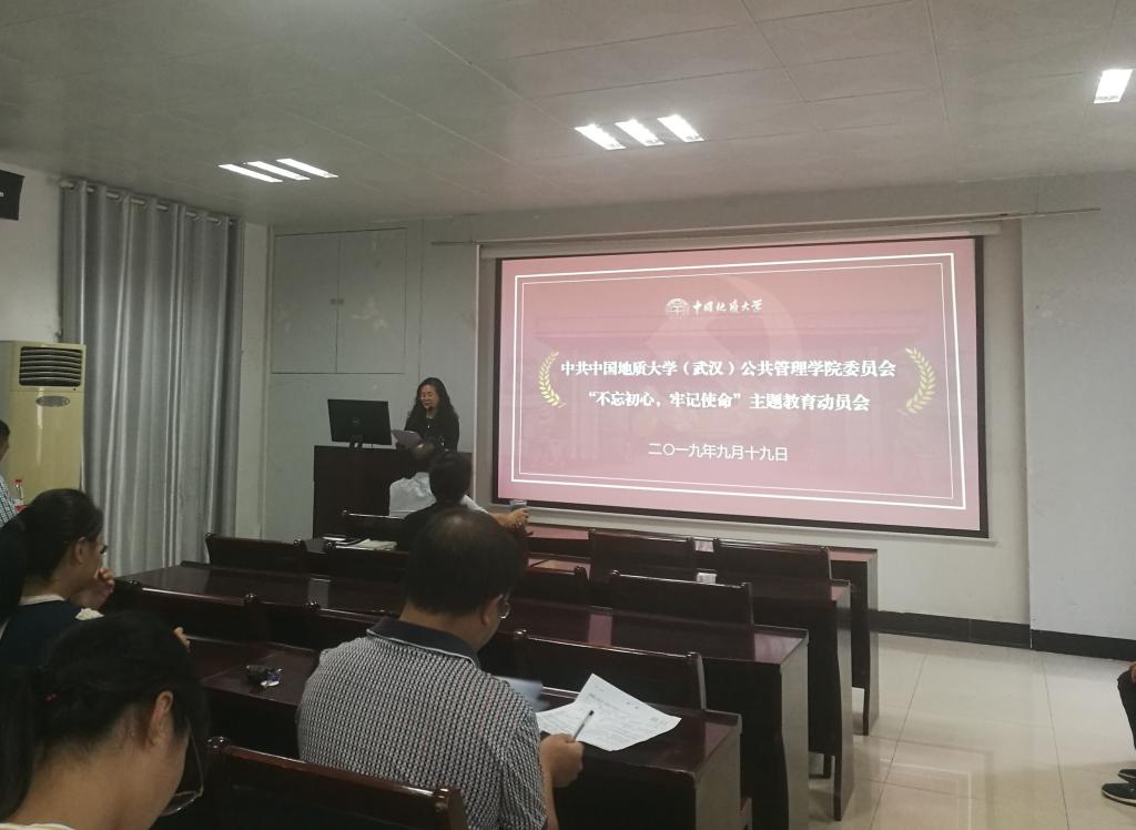 9月19日下午16:00,公共管理公司党委于公管实验楼101召开“不忘初心,牢记使命”主题教育动员大会,全体在校院领导、全体教职工党员、员工党员代表及公司主题教育第六指导组马彦周、江丰伟参加此次大会,会议由副经理才惠莲主持。