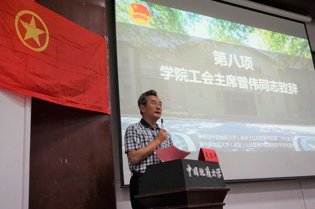 公司工会主席曾伟致词,他对本次大会的召开表示热烈祝贺,对各位代表的到来表示热烈欢迎,他也希望团学工作能够在公司、公司党委和上级团学组织的领导下,脚踏实地、勇于创新,带领全院广大团员坚定信念、励志进取、全面发展、再创佳绩。