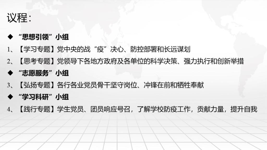 2020年2月28日晚,支部全体党员、多数团员通过华为WeLink平台开展线上防疫主题教育活动。按照“学习”、“思考”、“弘扬”、“践行”四大主题,由三个党小组牵头组织学习,在前期分组集中学习的基础上交流感想与心得,激发每一名党员、团员的责任感与使命感。