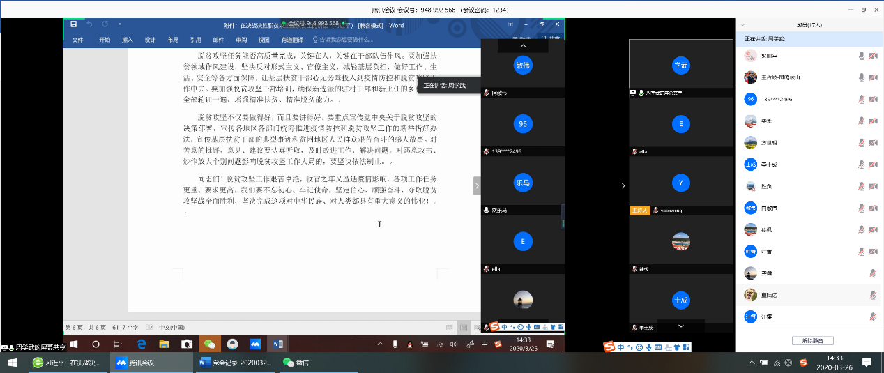 2020年3月26日下午两点,土地系通过腾讯会议,开展了“坚持不懈坚决打赢疫情防控和扶贫攻坚阻击战”主题党日学习活动。在系支部书记周学武教授的带领下,各党员教师一起认真学习了各项内容,并展开了积极、热烈地讨论。