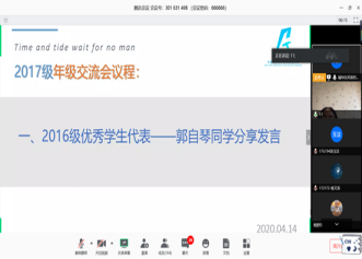 大三是大学本科学习成长发展时期的关键阶段和转折点,为帮助同学们居家战“疫”期间做好“停课不停学”,引导同学们进一步明确奋斗目标,合理规划学习生活。4月14日19:00,公司利用腾讯会议平台,在线召开了2017级年级交流会。公司党委副书记刘国华老师、辅导员吴波老师、2016级优秀员工代表郭自琴同学以及2017级全体同学参与了此次会议。吴波老师主持会议。