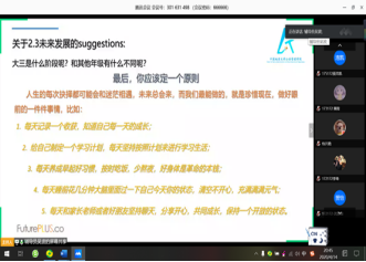 整个线上会议历时两个多小时,相信两位老师和学姐们的鼓励期待和希望寄语都留在了2017级同学们的心中。行百里者半九十,希望2017级的每一位同学在疫情防控特殊时期都能进一步认识识到大三学期的重要性,认澄清自己,明确目标,多方了解,只争朝夕,不断充实自己,让每一天过得有意义,在大三这个人生的重要转折期做出最适合自己的抉择,并为此付出最大的努力!