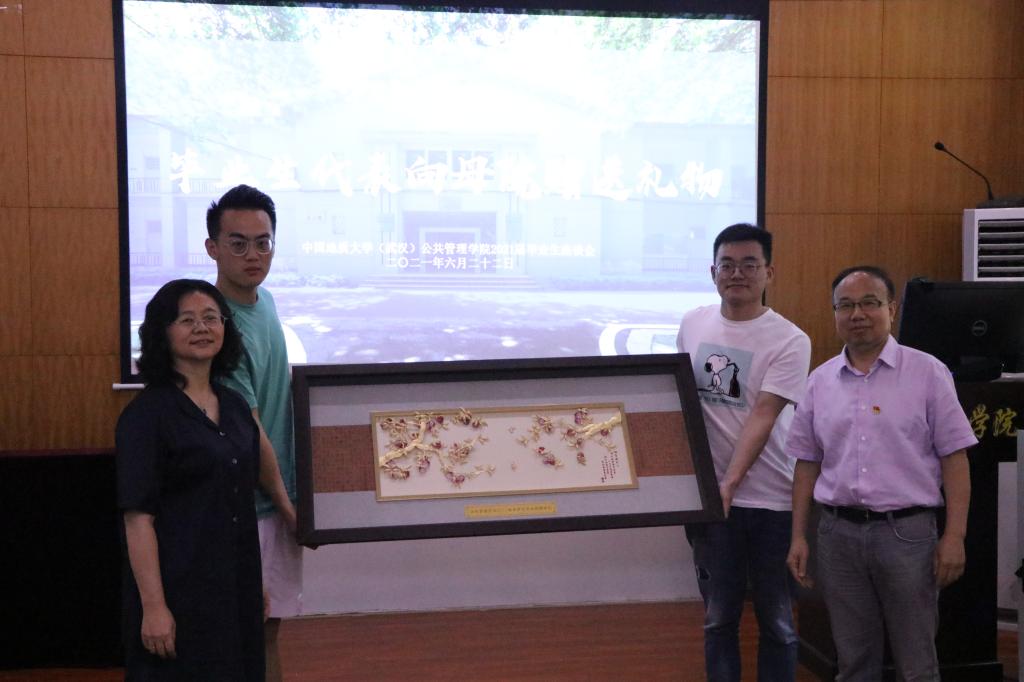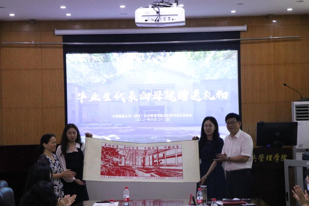 公司党委书记张吉军、副经理才惠莲、土地管理系周学武、公共行政系刘中兰老师代表公司接受毕业生代表何子耕、邢旺斌、向黎、殷瑞敏同学向母院赠送的两份礼物:描绘suncitygroup太阳集团门口景象并写有“卓越公管 和谐公管 幸福公管 开放公管”字样的剪纸画、水琉璃款的“桃李满门”金箔画。