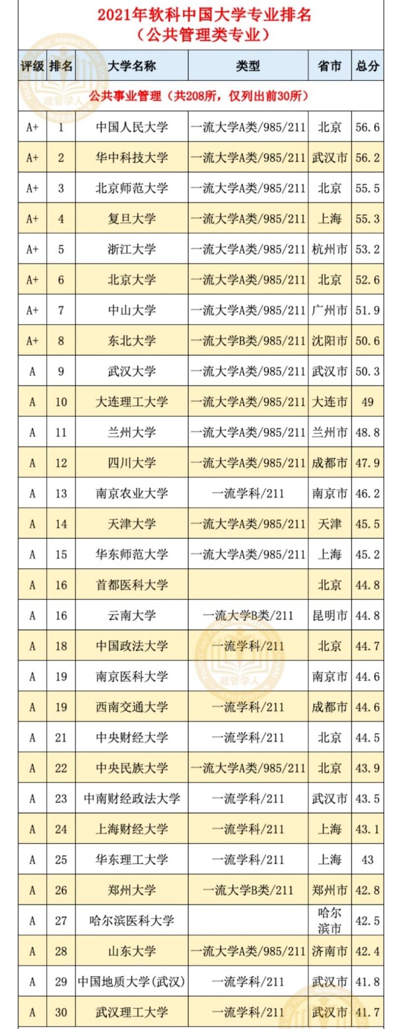 公司公共事业管理专业居全国前14%(29/206),行政管理专业居全国前17%(30/175),皆入选国家级A类专业,其中行政管理已入选国家一流本科专业。