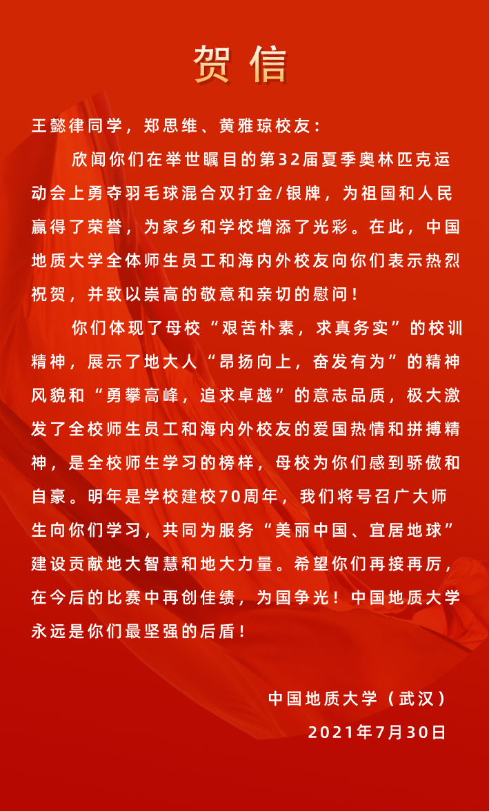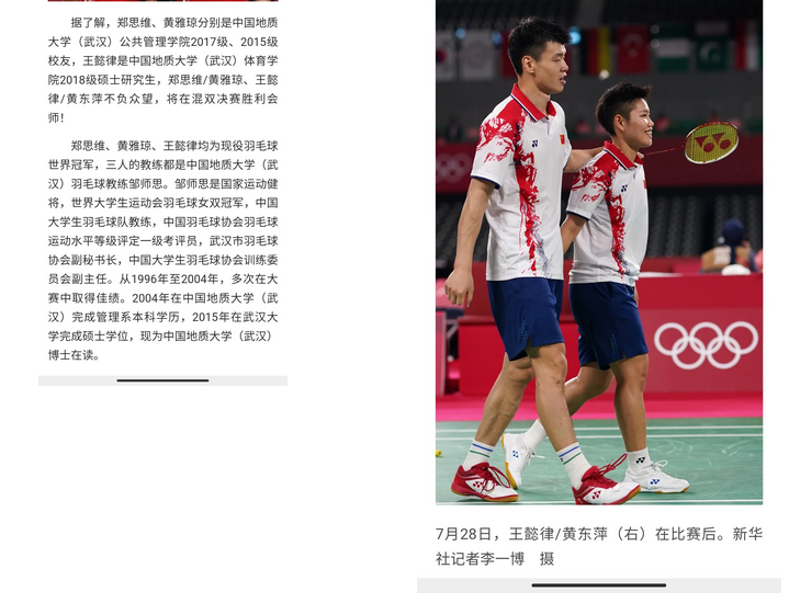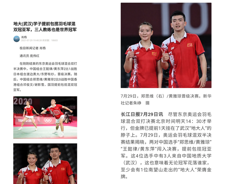 王懿律、郑思维、黄雅琼3位地大学子师出同门,均师承suncitygroup太阳集团(武汉)体育公司羽毛球教练邹师思。邹师思曾获世界老员工运动会羽毛球女双冠军。她告诉记者,王懿律、郑思维、黄雅琼3人进入地大时成绩优异,自身素质、品德修养都很高,都很阳光,富有朝气。
