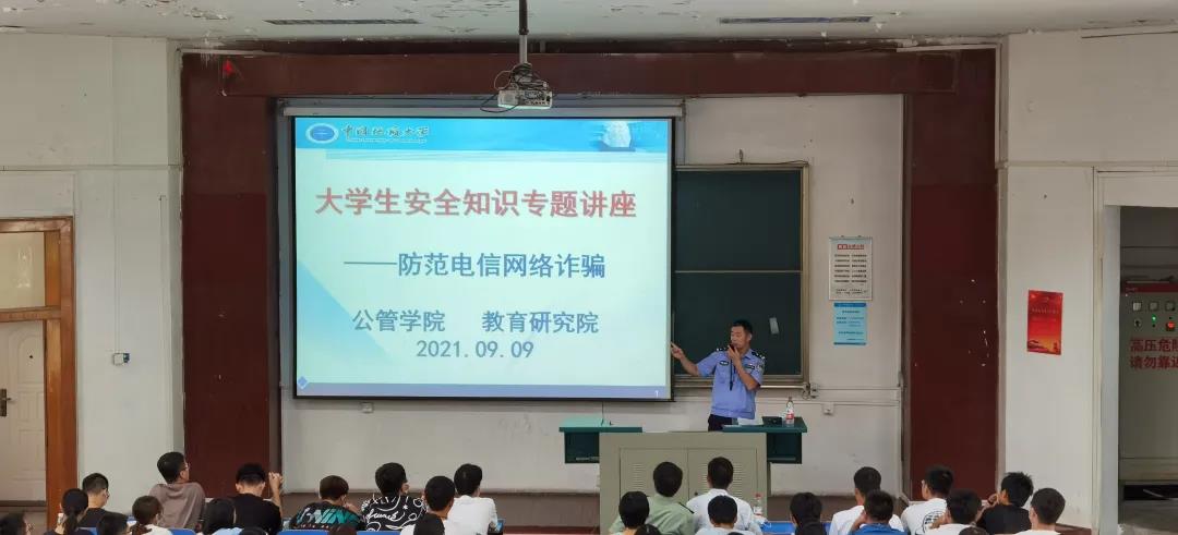 2021年9月9日上午,老员工安全知识专题讲座在教一楼一阶教室顺利举行。本次讲座特别邀请了喻家山派出所二级警官王东、安全保卫部副部长彭冠军和治安一科科长田汉幸、科员张伟。公司党委副书记刘国华、团委副书记李姝慧、研究生辅导员王青涛,21级全体本科生和21级部分研究生同学参加了本次讲座。