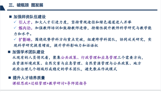 方世明老师在地质大学工作即将20个年头,他从团队队伍建设、教材建设、学术平台建设、学科体系建设等方面谈了自己未来的努力方向,表示自己有信心、有决心、有能力和土地资源管理系同事一起,为公司公共管理学科冲A贡献力量。