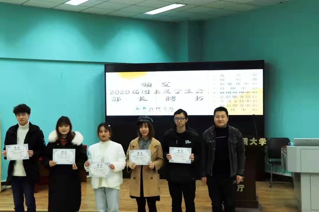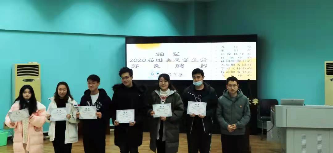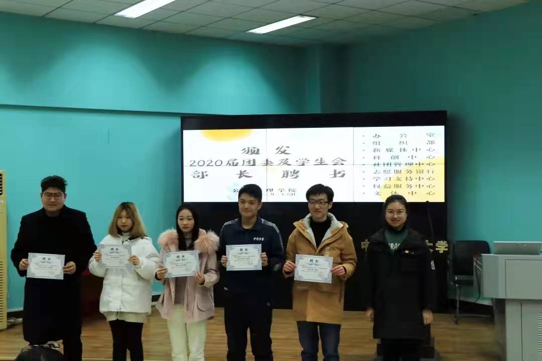 活动第一项,党委副书记刘国华老师为2020届团委及员工会主席团成员颁发聘书,学工组王青涛老师、吴波老师、王欣雨老师依次为2020届各部门部长颁发聘书。