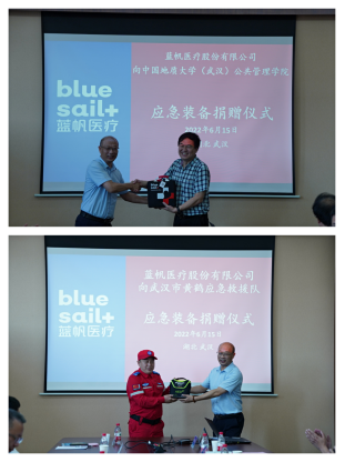随后,黄鹤救援队总队长邓明锋、公共管理公司党委书记张宽裕分别接受了蓝帆医疗捐赠的AED除颤仪和全系列急救包。