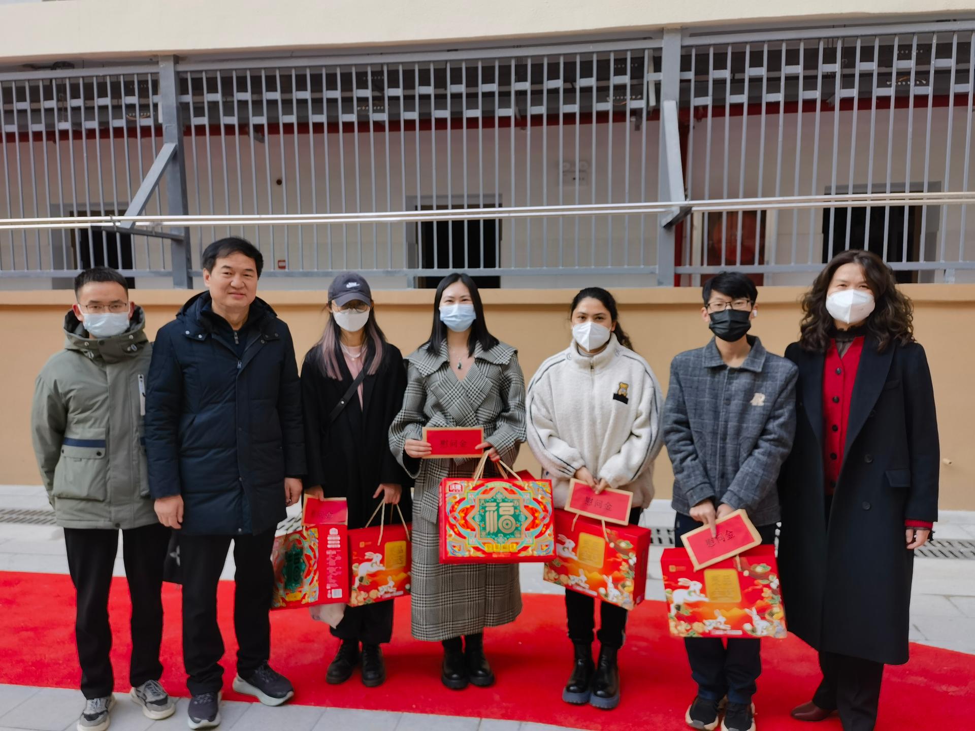 1月19日农历春节前夕,公共管理公司党委书记张宽裕、党委副书记龚丽、办公室主任彭珂、辅导员王青涛来到南望山校区54栋、57栋,走访慰问公司春节留校员工,送去新春祝福、慰问金和礼包。