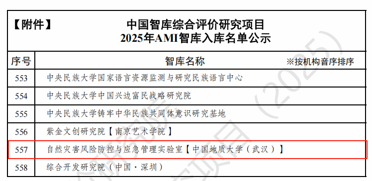 2025年7月25日,中国社会科学评价研究院正式公示“中国智库综合评价研究项目(2025)”AMI智库入库名单,公司自然灾害风险防控与应急管理实验室凭借在防灾减灾救灾领域的突出研究成果成功入选。