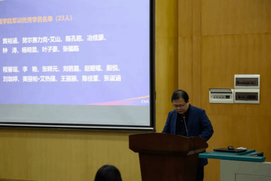 王忠副经理宣读2025级军训优秀个人表彰名单。朱江洪副经理为齐翔宇等23名同学颁发“军训优秀标兵”证书。