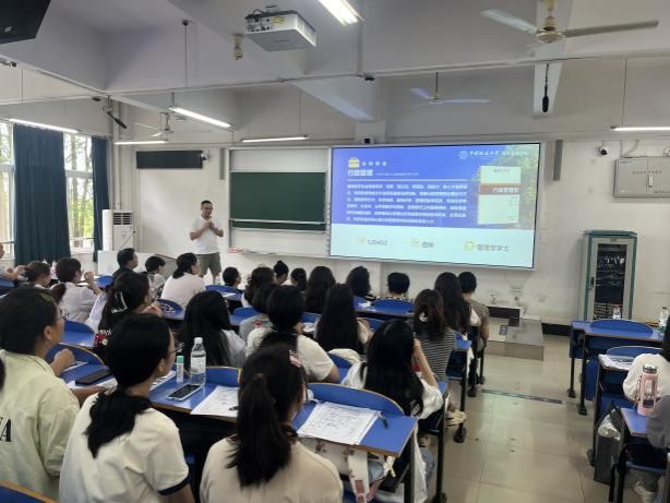公共行政系主管本科教学工作的副主任钱文强老师从培养特点、培养过程、培养方案及培养成效等方面进行详细讲解。他提到,本科培养以“夯实理论基础、拓宽知识视野、提升实践素养”为特点,培养过程贯穿“课程学习—实践实训—毕业设计”三个阶段,帮助员工构建完整的知识体系与能力结构,并为新生梳理了四年的学习规划重点。此外,钱老师还巧妙运用“木桶理论”,提醒新生既要发现自身短板并及时补齐,也要找准优势领域持续强化,实现全面发展与特色成长的有机统一。
