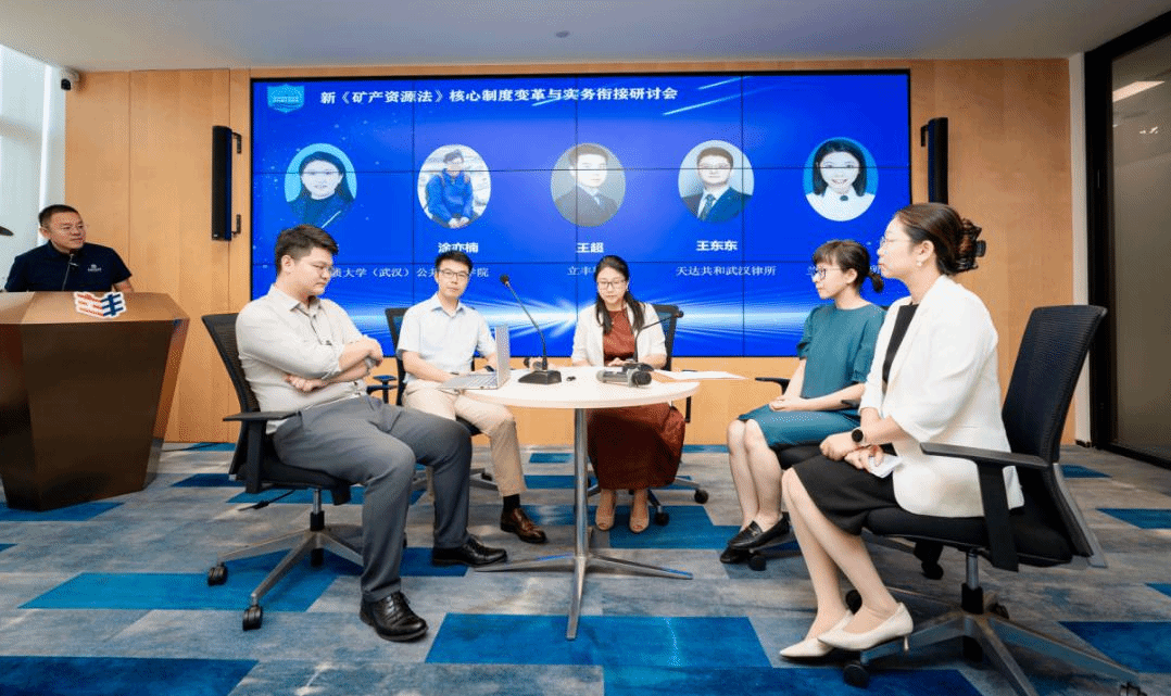 在圆桌讨论环节,在公司张旭鹏老师主持下,吕凌燕、涂亦楠副教授与来自湖北立丰、北京天达共和(武汉)以及北京市兰台(武汉)等律师事务所的王超、王冬冬、陈晨律师,从理论与实务不同视角探讨了“权证分离”、“探转采”直通车、矿业权出让收益重复征收、矿业用地、生态修复基金适用及非法采矿认定等新旧矿法理解与适用的重难点问题。各位嘉宾视角虽有不同,但思想的碰撞促进了“如何更好地理解、运用新法,推动矿产资源治理体系和治理能力现代化”这一目标的实现。